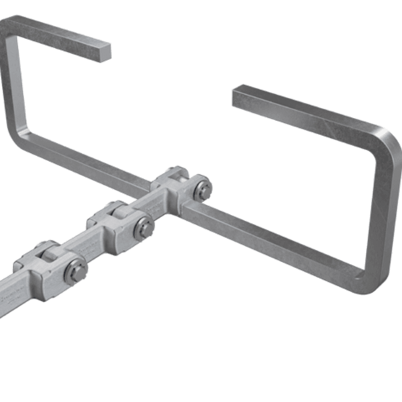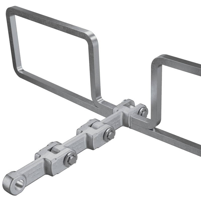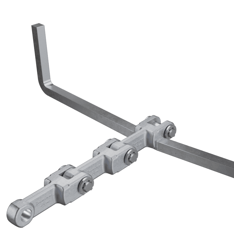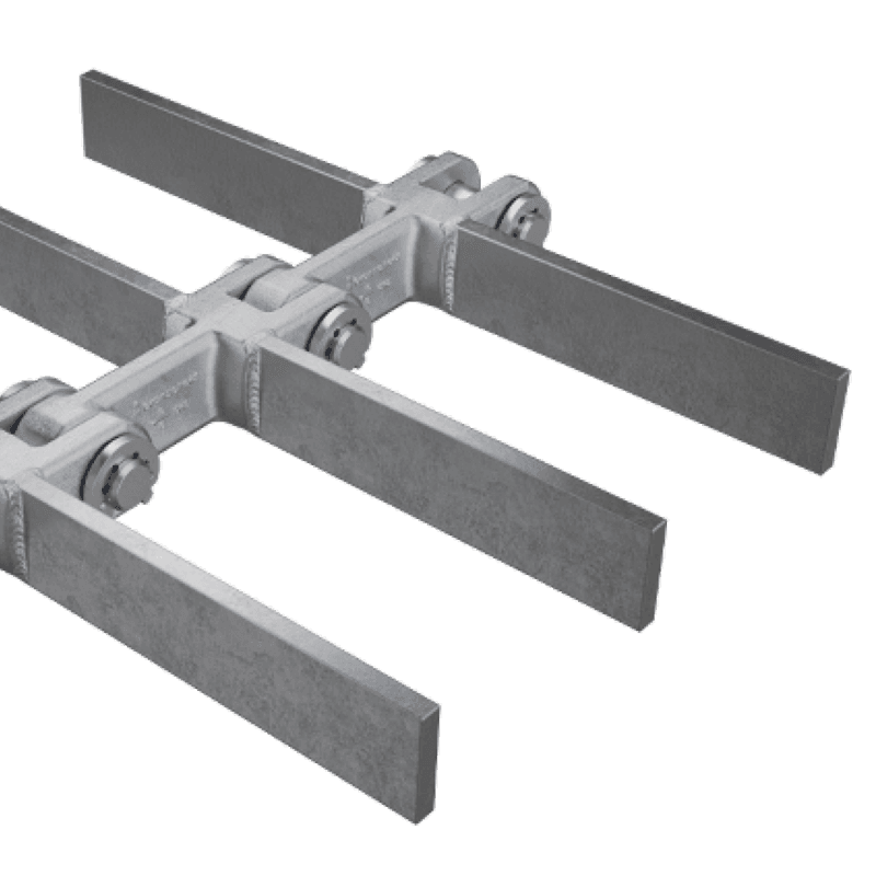 Fork link chains as single-strand chains are supplied in pitches between 102 and 315 mm and are always customised and individual solutions. The fork links we used are forged in our own production at the Branscheid Umformtechnik GmbH & Co. KG in Gevelsberg.