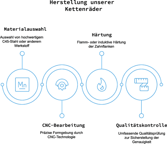 Unsere Kettenräder entstehen mit modernsten Fertigungstechnologien, um maximale Präzision und Zuverlässigkeit zu gewährleisten. Hochentwickelte CNC-Bearbeitungsanlagen ermöglichen eine exakte Verarbeitung, während computergesteuerte Härtungsverfahren – wie Flamm- und Induktionshärtung – für höchste Belastbarkeit sorgen.