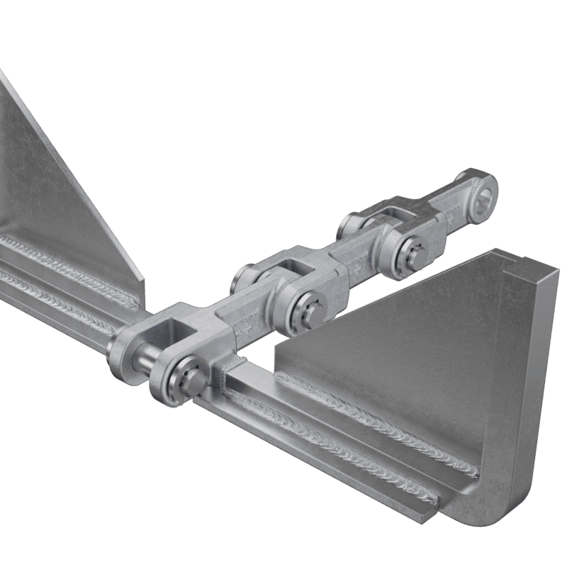 Fork link chains as single-strand chains are supplied in pitches between 102 and 315 mm and are always customised and individual solutions. The fork links we used are forged in our own production at the Branscheid Umformtechnik GmbH & Co. KG in Gevelsberg.